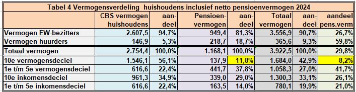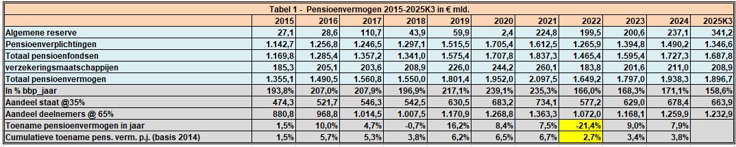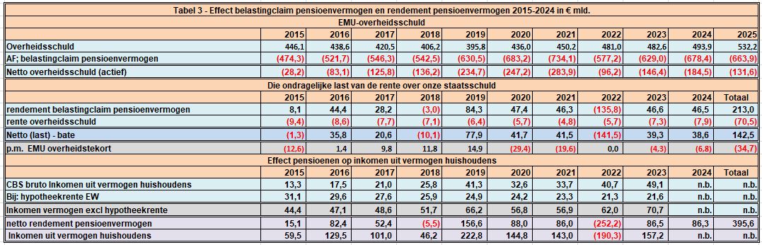 De statistieken van DNB leren ons dat het pensioenvermogen 30/9/2025 van pensioenfondsen en verzekeringsmaatschappijen inmiddels € 1.896,7 mld. bedroeg. Op dat pensioenvermogen rust dan nog een belastingclaim van ca 35% zodat die claim ca € 663,9 mld. bedroeg en €1.232,9 mld. per saldo aan het vemogen huishoudens valt toe te rekenen.